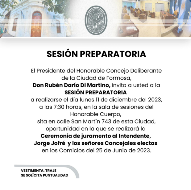 Invito a toda la ciudadanía, a la Sesión Preparatoria, oportunidad que se realizará la ceremonia de juramento al Intendente Jorge Jofré y los Concejales electos.