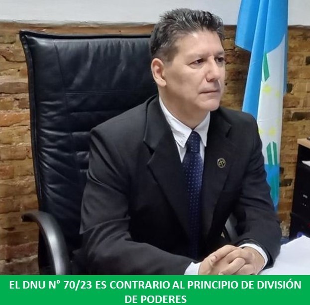El Ombudsman Provincial Dr. José Leonardo Gialluca advirtió que antes en los considerandos del Decreto se invoca el artículo 99 de la Constitución Nacional que "otorga al Poder Ejecutivo Nacional la facultad de emitir disposiciones de carácter legislativo en casos de necesidad y urgencia en los que sea imposible seguir el procedimiento normal de formación y sanción de las leyes", a la vez que menciona como antecedentes DNU de los ex presidentes Raúl Alfonsín y Eduardo Duhalde. Es que cuando mediante los DNUs se intenta sustituir integralmente al Congreso en su función legislativa, entonces mediante el desvío de poder y el abuso de derecho público se intenta obtener la suma del poder prohibida por la Constitución en el art. 29 y considerada traición a la patria. El DNU 70/2023 es un claro intento de suma del poder público, no acredita una situación de emergencia objetiva, solo una necesidad de imponer un proyecto político. El Congreso puede funcionar y debatir los temas, (el DNU) afecta la división de poderes y es contrario a la República. El Poder Ejecutivo no puede ejercer funciones legislativas bajo pena de nulidad absoluta e insanable porque viola la división de poderes tal como lo expresa el art. 99 de la Constitución.