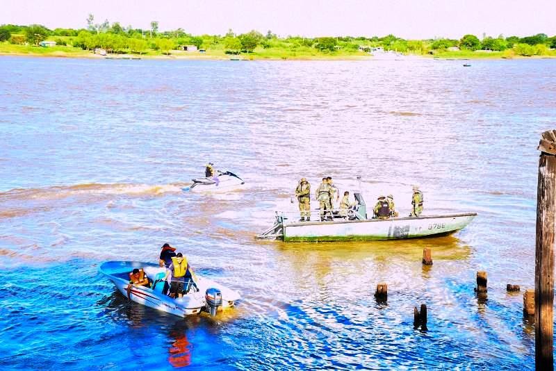 En el lugar se encuentran realizando búsqueda del menor personal del Cuerpo de Bomberos en forma conjunta con efectivos de Prefectura Naval en lanchas y moto de agua.