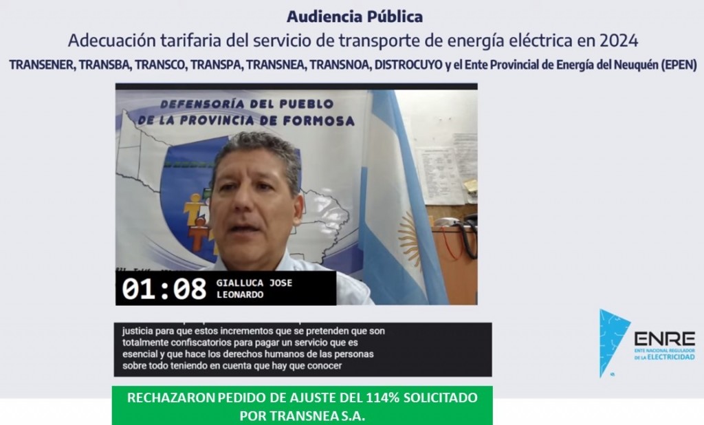 El Defensor del Pueblo de la Provincia de Formosa, Dr. José Leonardo Gialluca, notificó en el día de la fecha de la -Audiencia Pública- convocada por el -ENRE- y en la cual la Empresa TRANSNEA S.A. a través del Gerente de Operaciones, Gustavo Adolfo Paredes, solicitó a la Secretaria de Energía a cargo de Javier Chirilo y al actual Interventor del ENRE, Lic. Darío Oscar Arrué, “no aprueben la solicitud de ajustes presentado por TRANSNEA S.A. que llega a un 114% y se rechace también el pretendido mecanismo de actualización mensual de tarifas”. Desde el Organismo de la Constitución, se denunció que con los incrementos que se vienen autorizando en la generación y ahora posiblemente en el transporte, “hará que los usuarios residenciales tanto de los Niveles 2 y 3, como así los jubilados, pensionados, asalariados públicos, privados y pymes, se vean imposibilitados de hacer frente a las facturas del servicio público esencial de energía eléctrica”. El Ombudsman Provincial, denunció que las líneas de transporte a cargo de TRANSNEA S.A. tanto en las zonas de: Gran Formosa – Pirané, Gran Formosa – Ibarreta, Gran Formosa – Clorinda, Corredor Norte de Formosa, Formosa – Clorinda, “se encuentran todas sobresaturadas, lo cual, fue reconocido por el propio Gerente de Operaciones en la Audiencia Pública”. Asimismo, expuso que, desde hace tiempo existen Estaciones Transformadoras (ET) sin reservas, que se presenta una necesidad de cambios de celdas e interruptores, que tenemos problemas de comando a distancia de las ET, a lo que se le suma, además, faltante de limpieza y mantenimiento de electroductos, que ocasionan demoras injustificadas en caso de contingencias justamente por la falta de equipamiento, de personal idóneo y capacitación, “todo ello responsabilidad exclusiva de TRANSNEA que lleva 30 años brindando un servicio altamente deficiente”. Gialluca rechazó lo afirmado por la transportista en relación a que entre enero del 2017 a enero del 2024 han bajado las fallas de líneas de TRANSNEA, haciendo notar que ello es falso y por su irresponsabilidad y falta de inversiones, dejan ciudades y pueblos enteros por más de 5 o 6 horas sin energía eléctrica. Manifestó el Funcionario Provincial que la virtualidad de las Audiencias Públicas, lo que se ha puesto de moda en los últimos tiempos, atenta contra una de las características de este importante acto de participación ciudadana, que es la inmediación, impidiendo a usuarios, asociaciones, comercios y otros, poder involucrarse y exponer sus posturas, por lo que, solicitó que se vuelva a la presencialidad o se implemente un sistema hibrido. En la misma, exigió a los Funcionarios Nacionales, bajo pena de incurrir en incumplimiento de sus deberes a cumplir con los requisitos ordenados por la CSJN en el caso -CEPIS-, en relación a la proporcionalidad, razonabilidad, gradualidad y no confiscatoriedad del salario, como reglas a cumplir para todo aumento tarifario de servicios. Recordó que, el Máximo Tribunal de Justicia, ordenó, “que los incrementos tarifarios deben estar atados a los aumentos salariales, como así también se debe establecer una Tarifa Social Única, homogénea y de simple acceso para todos los beneficiarios, como, además, un Consejo de Control que elabore informes semestrales sobre el cuadro de inversión y los cuadros tarifarios, lo que hasta la fecha no se cumple”.