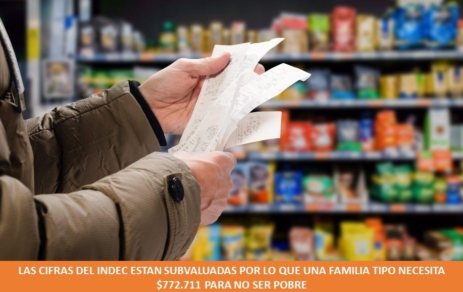 En el primer mes del año, la canasta básica tuvo un aumento por encima de la inflación, por lo que una familia conformada por 2 adultos y dos menores de edad, necesitaron un ingreso de $596.823 para no ser considerada pobre, mientras que para no caer en la indigencia el valor es de $285.561, según datos dados a conocer por el INDEC. Durante el mes de enero del 2024, la variación mensual de la Canasta Básica Alimentaria (CBA), fue de 18,6%, mientras que la de la Canasta Básica Total (CBT) fue del 20,4%, lo que empeoraron las condiciones de vida de millones de consumidores, siendo necesario resaltar las alarmantes cifras que confirman que el 60% de las niñas y niños están comprendidos en el nivel de pobreza. La canasta básica total se utiliza para medir el umbral de pobreza por ingresos, estableciendo que aquellos individuos o familias que perciban ingresos inferiores son considerados pobres; mientras que la canasta básica alimentaria, establece el límite de la indigencia, incluyendo así a las personas y familias que no llegan a completar las 4 comidas diarias. En estos casos, no se incluyen los denominados gastos estructurales como pueden ser los alquileres y al mismo tiempo se subvalúan, esto es se disminuyen las necesidades alimentarias, por lo que lo publicado por el INDEC es relativo y en la realidad lo que necesita una familia tipo en la actualidad para no ser pobres asciende a $772.711. Con estos números, el Salario Mínimo, Vital y Móvil (S.M.V.M.), que desde diciembre se mantiene en $156.000, alcanza apenas para cubrir el 54,63% de la canasta alimentaria. Por otro lado, solo cubre el 26,14% de las necesidades totales de una familia.