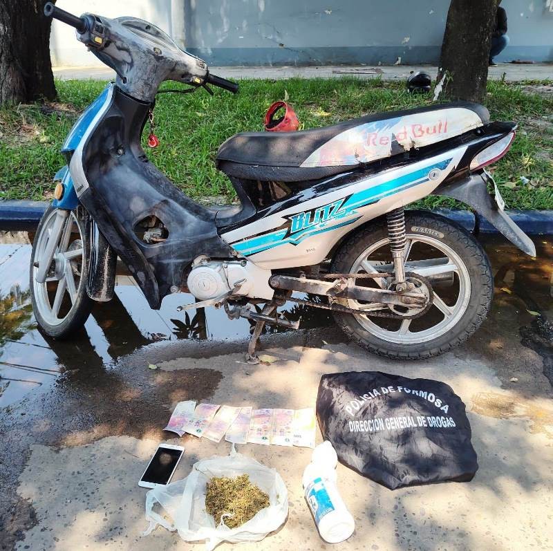 La Policía detuvo a un hombre de 30 años que circulaba en una motocicleta Motomel Blitz con varios gramos de marihuana en el microcentro de nuestra ciudad capital; situación que derivó en el allanamiento de una vivienda en el barrio Eva Perón.