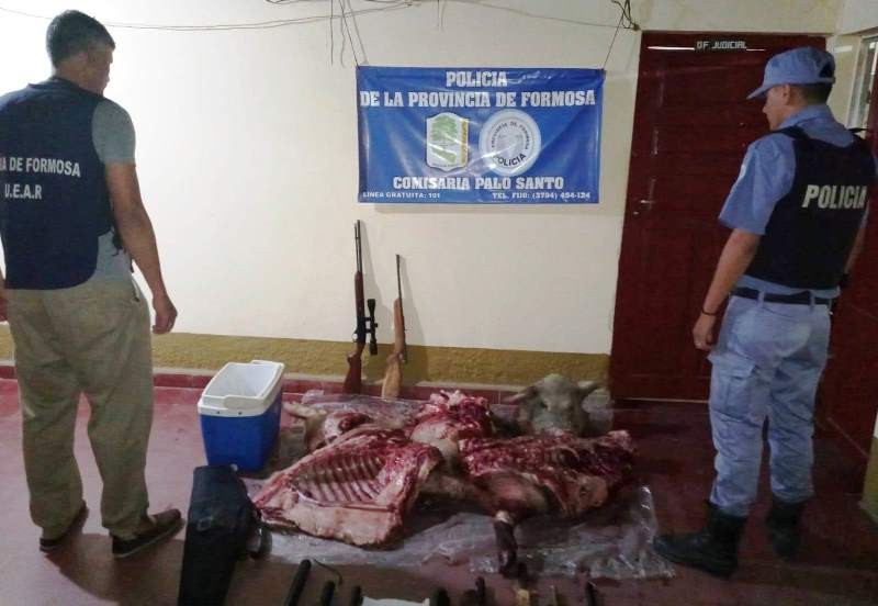 En el marco de las tareas de prevención, la Policía detectó a dos sujetos que circulaban en automóvil Fiat Palio por la Ruta Nacional N° 81 y su empalme con la Provincial 23, con carne porcina recientemente faenada, armas de fuego, cuchillos, linternas y conservadora.