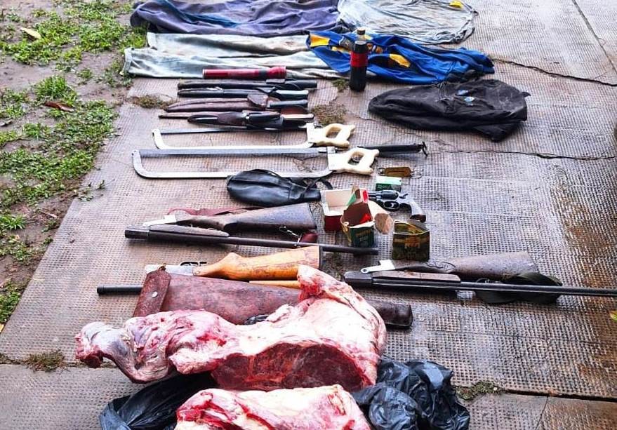 Los allanamientos culminaron con el secuestro de cinco escopetas, un revólver, 15 cartuchos calibres 16, 14 cartuchos calibres 38, cuatro cartuchos 7.62, cinco cuchillos con grasa vacuna, dos balanzas, carne vacuna, un freezer, prendas de vestir con manchas de sangre y linterna.