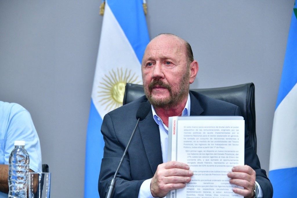 Tras anunciar un incremento en los haberes de los agentes activos y pasivos del Estado provincial del 27% a partir del primer día del mes de mayo, el gobernador Gildo Insfrán encabezó una conferencia de prensa.