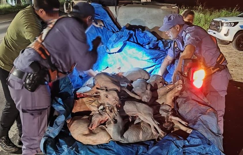 Efectivos de la Unidad Especial de Policía Ecológica (UEPE), demoraron a un infractor que se desplazaba por la Ruta Nacional 81, en un utilitario, con 18 porcinos faenados, sin respetar la cadena de frío ni las documentaciones reglamentarias para esa actividad.