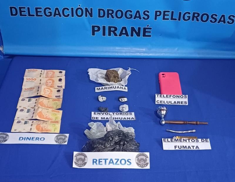 La Policía detuvo a tres jóvenes en Pirané que tenían trozos de marihuana, teléfono celular y dinero; además se realizó un allanamiento en un inmueble ubicado en el barrio 120 viviendas, donde secuestraron más trozos de la misma sustancia, pipas y otros elementos.