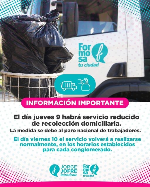 La Municipalidad de la ciudad de Formosa, informa que el día jueves 9 de mayo, con motivo del paro general de actividades convocado por CGT, solo se ofrecerá de un servicio de recolección de residuos reducido que ingresará a avenidas principales en dos turnos, 6hs y 13hs.