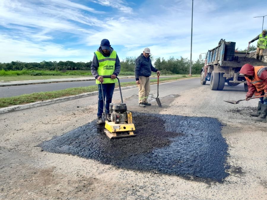 Durante la jornada del miércoles, cuadrillas comunales se desplegaron en la extensión de la avenida Ribereña para dar continuidad a los trabajos de bacheo, aprovechando que esta arteria se encuentra cerrada por tareas de mantenimiento en las cabeceras del puente sobre el riacho Formosa.