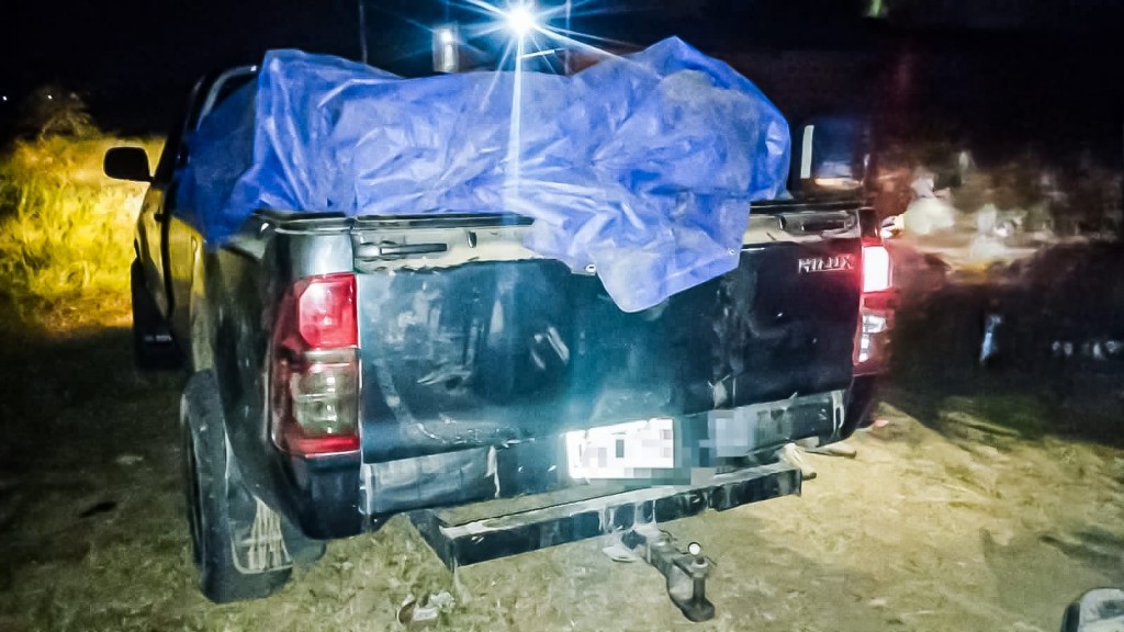 En la caja de la camioneta transportaban varias cajas de cartón tapados con una lona, que presumiblemente eran mercaderías ingresadas al país por pasos fronterizos clandestinos y no habilitados, sin aval aduanero.
