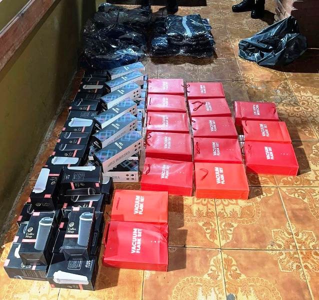 Bajo las formalidades legales y en presencia de testigos, se secuestraron 24 tazas de metal, 30 termos de metal, 16 conjuntos deportivos, entre otros bienes, sin aval aduanero.