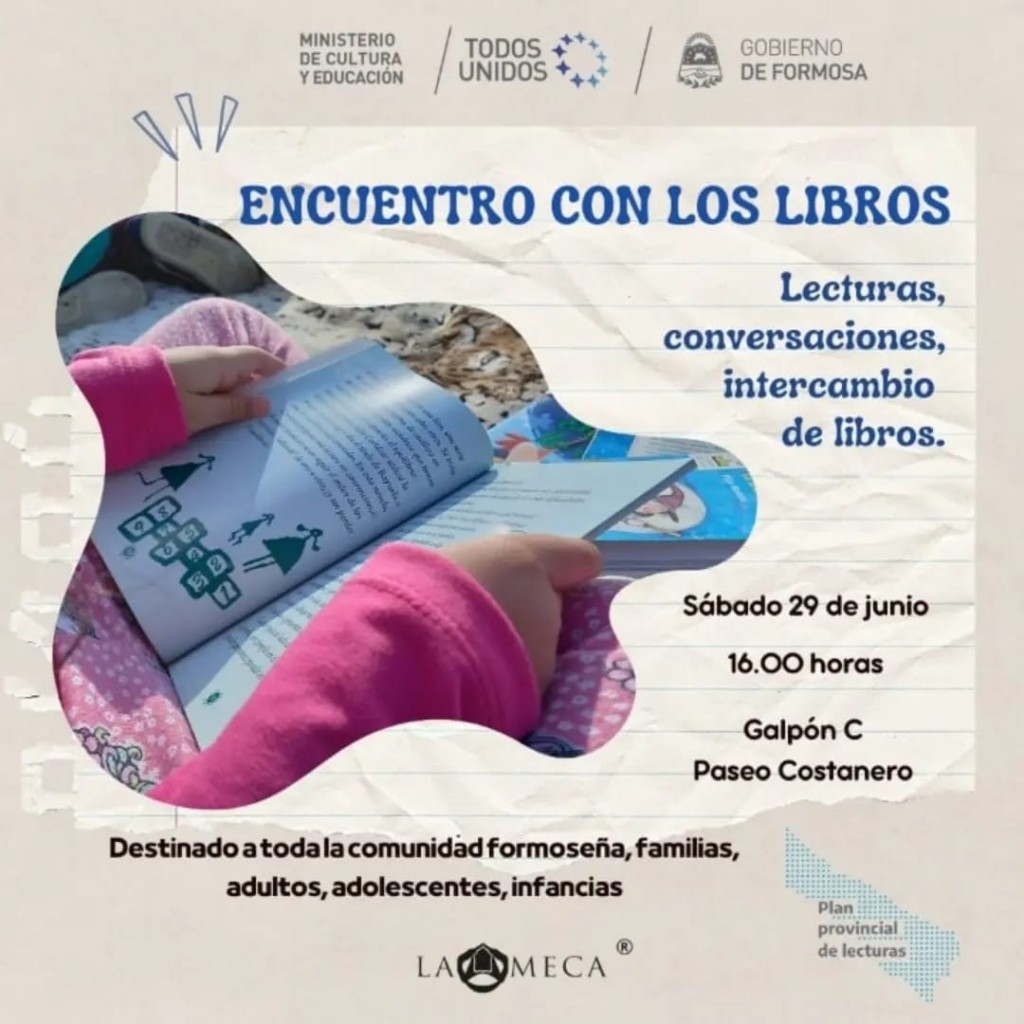 En el marco de la Provincialización de Formosa, que se celebra este viernes 28 de junio, el Plan de Lecturas del Ministerio de Cultura y Educación de Formosa, en articulación con el espacio de Aprendizaje en la Meca, llevará a cabo una actividad denominada: “Encuentro con los Libros”, una propuesta que contempla a la lectura, conversaciones e intercambios de libros.