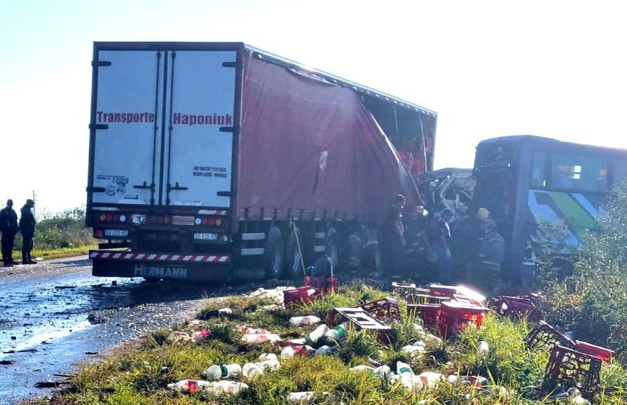 En el lugar los efectivos policiales constataron la colisión entre un camión Iveco perteneciente a una reconocida empresa de gaseosas y un colectivo de transporte de pasajeros.