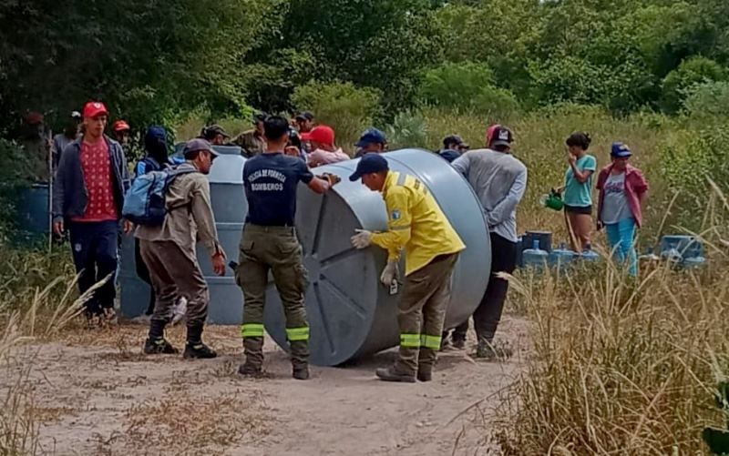 Efectivos del Cuartel Central de Bomberos, Destacamento de Bomberos Clorinda, con la colaboración del personal de la Unidad Especial de Asuntos Rurales (UAER) Sección Riacho Negro y el Servicio Provincial de Agua Potable (SPAP) Clorinda, atravesaron más de 1.500 metros de palmar y monte para proveer de agua potable a unas 65 familias que viven en la Isla Apando.