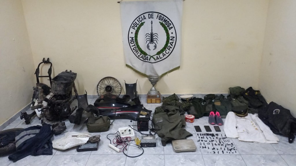 En la casa, los policías encontraron un cuadro de una Zanella ZB, otro de una Gilera Smash, varias motopartes, herramientas para el desguace de las motos, equipo de comunicación (radio base), dos uniformes del Ejército y partes de un fusil.