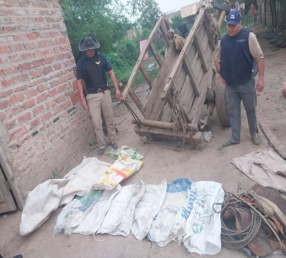 Efectivos de la Unidad Especial de Asuntos Rurales (UEAR), Delegación Loma Senes, detuvieron a dos hombres de 31 y 47 años; secuestraron cuchillos, teléfonos celulares, dos caballos, una mula, un carro de madera y esclarecieron un hecho de abigeato calificado.