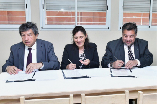 Firmaron el convenio el ministro de Cultura y Educación, Julio Aráoz; el ministro de Desarrollo Humano, Aníbal Gómez; la titular de Comunidad, Gloria Giménez; y el ministro de Gobierno, Jorge Abel González.