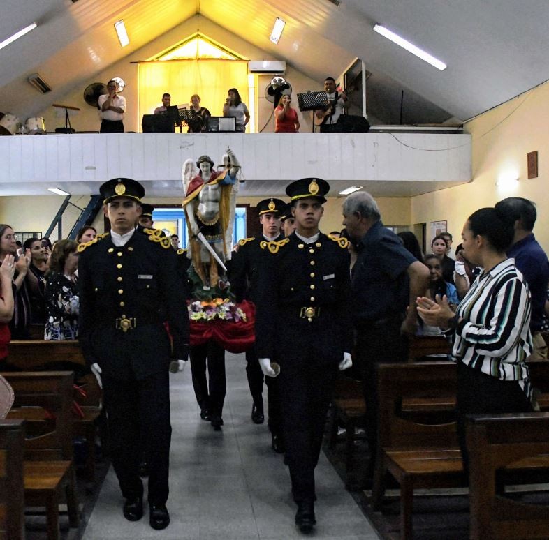 Integrantes de la Institución policial en servicio, retirados, vecinos y devotos formaron parte de la procesión y misa en honor al patrono de la Policía provincial San Miguel Arcángel, presidida por el párroco de María Auxiliadora, Padre Guillermo Estavilla.