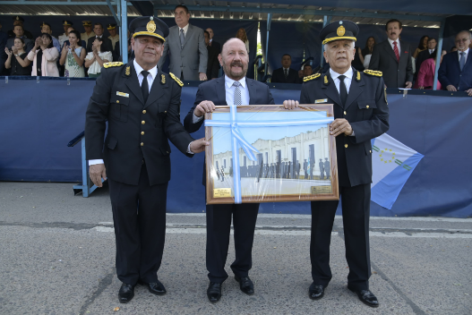 Acto seguido, el jefe Walter Arroyo y el subjefe, el comisario general Juan Moisés Villagra, entregaron un presente recordatorio al primer mandatario provincial.