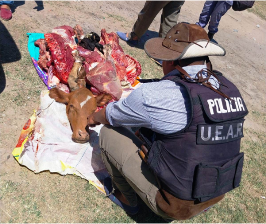 La intervención estuvo a cargo del personal de la Unidad Especial de Asuntos Rurales (UEAR), el sábado último a las 08:45 horas, en el barrio Lote 111 de esta ciudad.   Al notar la presencia de los uniformados, abandonaron el vehículo frente a la manzana 75 y rápidamente se dieron a la fuga.   Luego el personal de la División Policía Científica encontró en el baúl carne vacuna y los investigadores descubrieron el lugar donde habían faenado el animal, además de hallar al propietario e individualizar a los cinco sujetos.   Ante el caso, se inició a una causa judicial por el delito de “Abigeato Calificado”, con intervención de la Justicia provincial; mientras siguen las tareas investigativas para aprehender a los cinco sujetos.