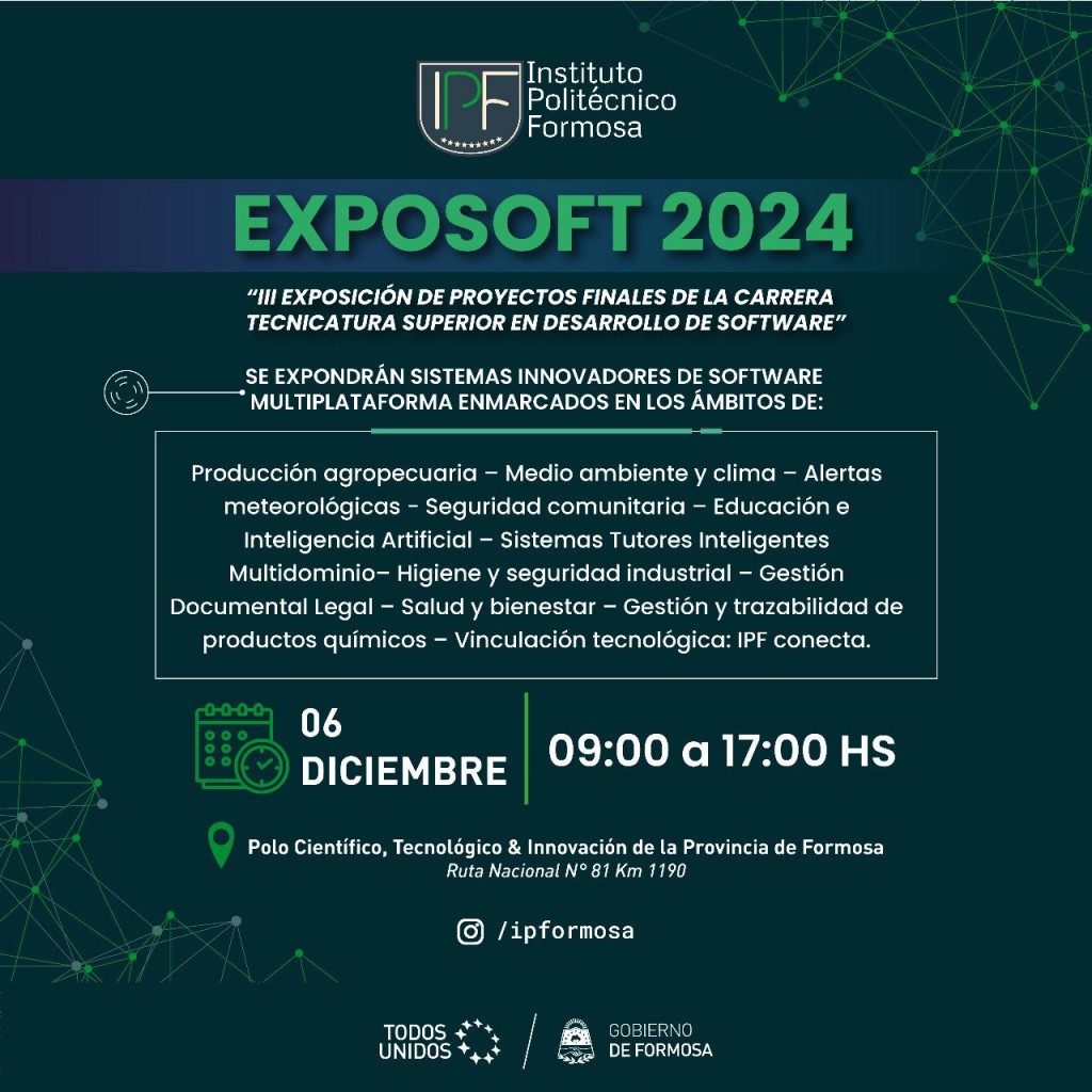 La denominada Exposoft 2024 tendrá lugar el viernes 6 de diciembre en el Polo Científico, Tecnológico y de Innovación (PCyI), que se encuentra en Ruta Nacional N° 81 Kilómetro 1190. En dicho evento se expondrán aquellos proyectos finales integradores de la carrera de la Tecnicatura Superior en Desarrollo de Software Multiplataforma del Instituto Politécnico Formosa (IPF).