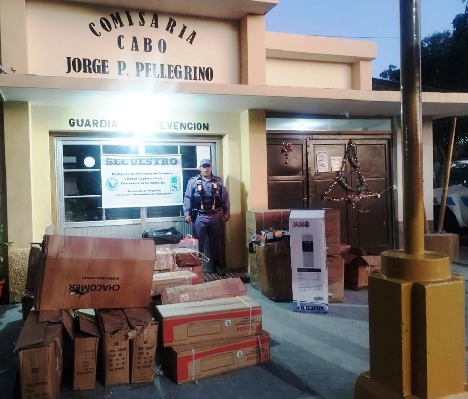 El vehículo, que circulaba por Ruta Nacional N°11 con sentido Norte-Sur, fue demorado por efectivos de la Delegación de Seguridad Vial. Los uniformados solicitaron las documentaciones de la camioneta y licencia para conducir. Al verificarse la caja del rodado, se constató que llevaban un cargamento de dos televisores Smart de 50 pulgadas, 11 bicicletas de distintos rodados, cuatro triciclos para armar, cuatro aires acondicionados, un dispenser, cuatro ménsulas de metal, seis planchas para cabello y 40 vasos metálicos.