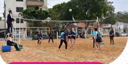Puede ser una imagen de 7 personas, personas jugando al voleibol, playa y texto