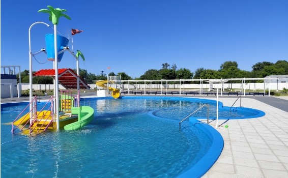 Cuenta con una pileta de mayor tamaño y profundidad para adolescentes y personas mayores; dos piletas de menor dimensión para niños menores; pérgolas metálicas resistentes a la intemperie y cubiertas con lonas para brindar sombra, además de un lugar para la revisión médica, canchas de vóley de playa con suelo contenido de arena, juegos acuáticos y toboganes para niños, sendas de circulación y espacios verdes de esparcimiento.