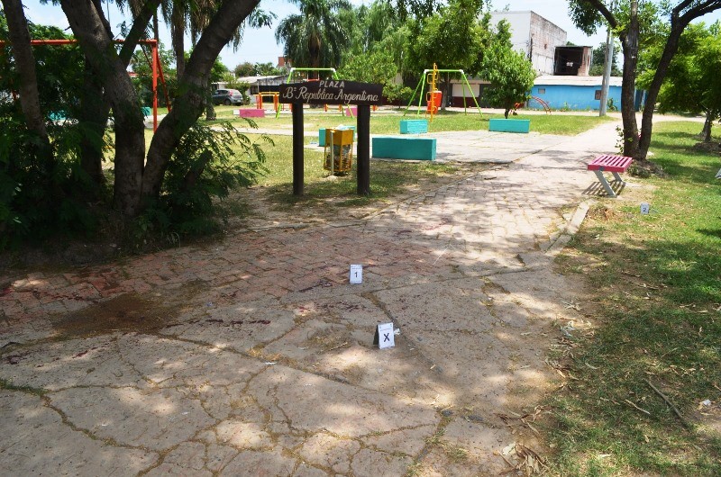 Además se verificó el sector de la plaza donde se produjo el desafortunado caso y se constató manchas de sangre y restos de botellas.