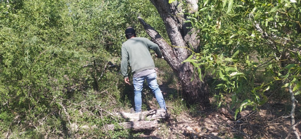 El hombre se encontraba sentado en el suelo, con el torso descubierto, descalzo, vistiendo un pantalón largo de color verde y deshidratado.
