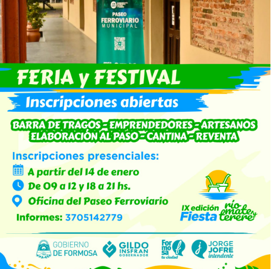 La Municipalidad de Formosa, mediante la Subsecretaría de Deporte, Cultura y Turismo, informa que, a partir del martes 14 de enero, estarán abiertas las inscripciones para todos aquellos emprendedores y feriantes que quieran exhibir y comercializar sus productos en la IX Edición de la Fiesta del Río, Mate y Tereré, a realizarse el próximo 1 y 2 de febrero.