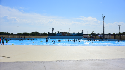 Allí los chicos pueden recorrer el parque, disfrutar de los toboganes en altura, como también del atractivo principal: la pileta que genera olas, simulando el mar. Antes de volver a su casa, cada niño recibe un refrigerio.