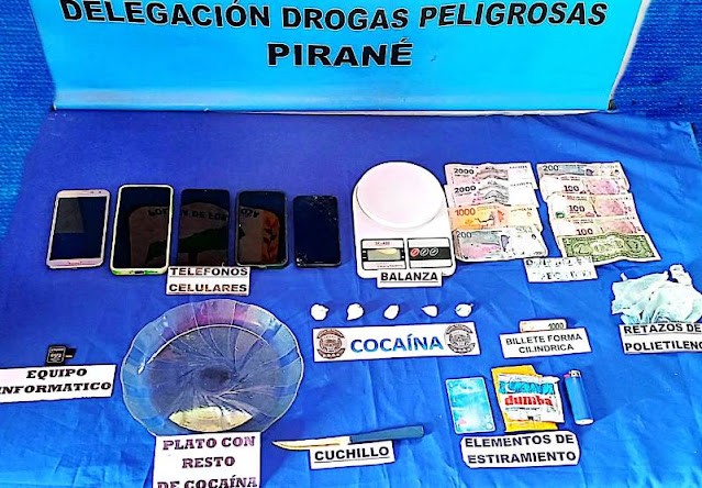 Efectivos de la Delegación Drogas Peligrosas Pirané detuvieron a dos hombres, secuestraron envoltorios de cocaína, celulares, pesos y dólares, una motocicleta y otros elementos que confirman la actividad ilícita.