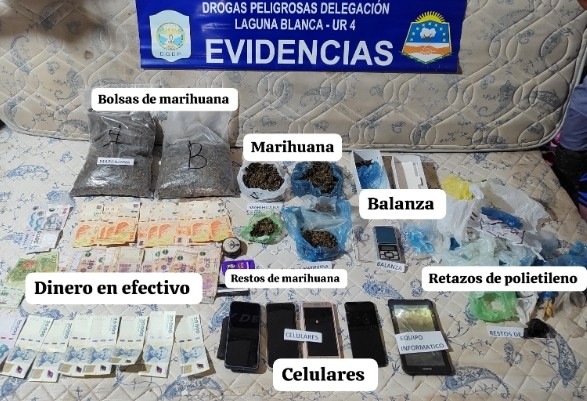 Efectivos de la Delegación Drogas Peligrosas Laguna Blanca, secuestraron cannabis sativa, teléfonos, balanza, elementos de almacenamiento y estiramiento; además detuvieron a tres sujetos de 21, 22 y 27 años.