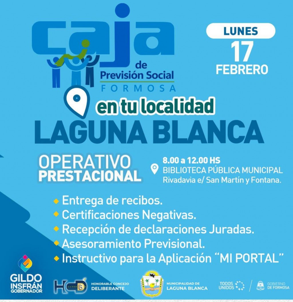 Este lunes 17 del febrero los agentes previsionales visitarán la localidad de Laguna Blanca, el operativo prestacional dará inicio a las 8 y se extenderán hasta 12 en la sede de la Biblioteca Pública Municipal, sita en Rivadavia e/San Martín y Fontana.