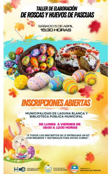 El próximo sábado 5 de abril a las 15.30 hs, la Municipalidad de Laguna Blanca y la Biblioteca Pública Municipal, presentan el taller de elaboración de roscas y huevos de pascuas.