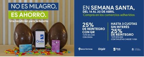 La campaña, bajo el lema “NO ES MILAGRO, ES AHORRO, en Semana Santa, una bendición para tu bolsillo”, busca brindar un alivio a la economía de las familias formoseñas en una fecha donde los gastos suelen incrementarse por encuentros, viajes y tradiciones. Los beneficios alcanzan a quienes operen con las tarjetas de crédito Chigüé y Visa del banco, y también a quienes usen la billetera digital Onda, una herramienta que se ha extendido en toda la provincia.
