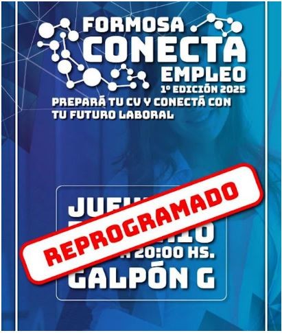 Este martes 10 de junio, la Subsecretaría de Empleo, dependiente del Ministerio de Economía, Hacienda y Finanzas, informó que “por razones de fuerza mayor, el evento ‘Formosa Conecta Empleo 2025’, inicialmente previsto para este jueves 12 de junio, será reprogramado”.