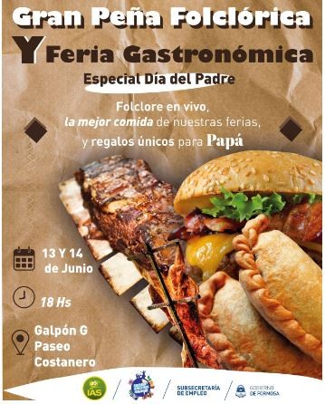 Con motivo del Día del Padre, la Subsecretaría de Empleo organiza la Gran Peña Folclórica y Feria Gastronómica, Especial Día del Padre, una propuesta cultural y comercial que se desarrollará los días 13 y 14 de junio, de 18 a 00 horas, en el tradicional gGalpón G del Paseo Costanero de la ciudad de Formosa.