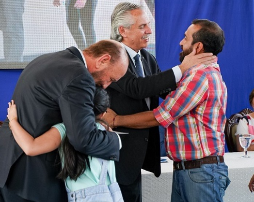 De esta manera, Estela Ortencia Castillo, Carlos Gustavo Corbalán, Victoria Raquel Gómez y Silvia Elizabeth Aguilar, acompañados por sus familias, recibieron las llaves y documentaciones correspondientes de sus nuevos hogares en representación al resto de los beneficiarios, de la mano del primer mandatario nacional y el gobernador local.