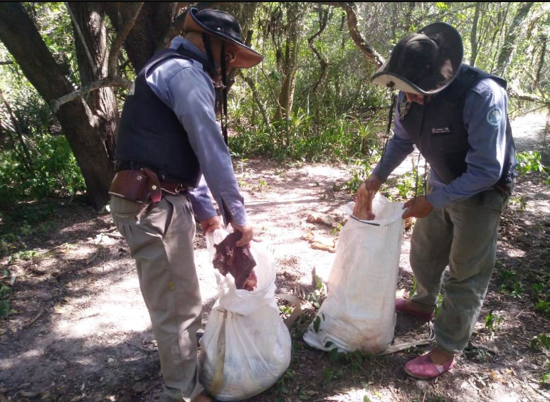 Inmediatamente tras realizar  seguimiento de huellas dejadas por  los abigeos, constaron  cuatro bolsas  de arpillera  conteniendo productos cárnicos, haciendo un total  de  196 kg.