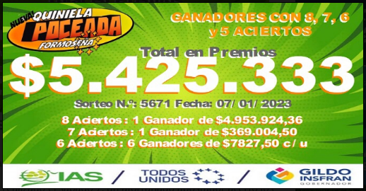 En el Sorteo Nº 5671 realizado el sábado 7, un afortunado apostador acertó los ocho números y se adjudicó el primer premio de la Quiniela Poceada Formoseña, según informó el Instituto de Asistencia Social (IAS).
