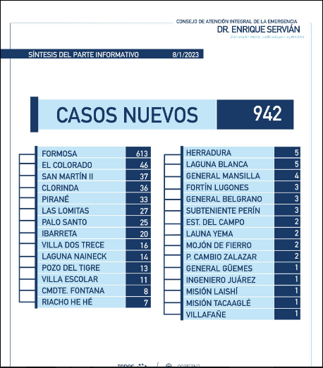 La mayoría de los casos se registran también en Capital (613), seguida por El Colorado con 46 casos y San Martín II con 37 casos. Asimismo, se reportó el alta durante la semana de 1.064 personas.