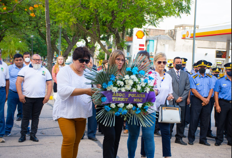 Tras la lectura del instrumento legal por el cual la Policía de la Provincia se adhirió al 77° Aniversario de la gloriosa Policía de TT. NN, se realizó un depósito de ofrendas florales y posteriormente un toque de silencio en el monolito que perpetua la memoria de los integrantes de la Policía de los Territorios Nacionales, ubicado en la plazoleta de la avenida 25 de Mayo y calle 17 de Octubre de esta ciudad.