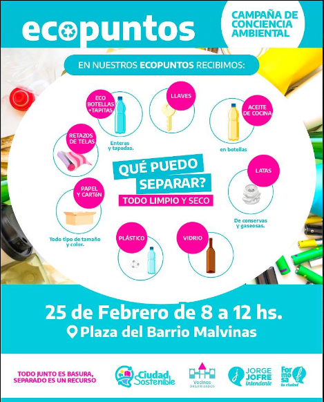 De este modo, invitan a los vecinos y vecinas a acercarse al Eco Punto que instalará el área comunal, donde se recibirán residuos inorgánicos, secos, reciclables y reutilizables para transformarlos y convertirlos en nuevos recursos. Entre los elementos que se recibirán, figuran eco botellas, tapitas, llaves, latas, retazos de telas, papel, cartón, plástico, vidrio, latas y aceite en botellas.