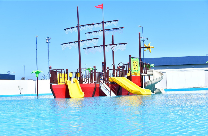 Por un lado, la pileta de olas tiene una capacidad de 1300 personas; con acceso símil “playa de arena”, con sistema de olas artificiales, apto para todas las edades. Tiene una dimensión de 3476 metros cuadrados de superficie de espejo de agua.
