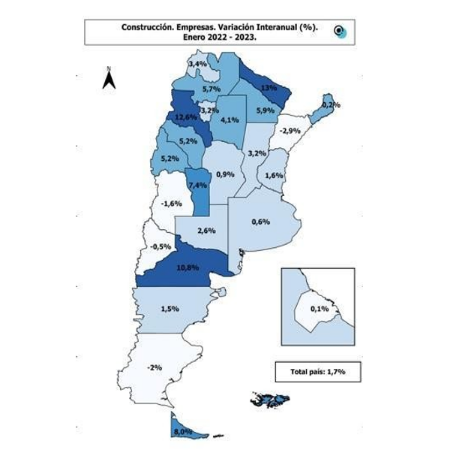 En lo que refiere a empresas en el rubro de la construcción, el observatorio de Políticas Públicas de Formosa POLITIKË explicó que contemplando el tipo de actividad (Constructoras/Contratistas, Subcontratista) se observó que en el país a enero del 2023 hubo un crecimiento del 1,7% comparándolo con el mismo mes del año pasado, es decir 353 nuevas empresas. Por su parte, la provincia que presentó mayor crecimiento interanual a enero del 2023 en el país fue Formosa con el 13%, incorporando así 24 nuevas empresas en el sector.