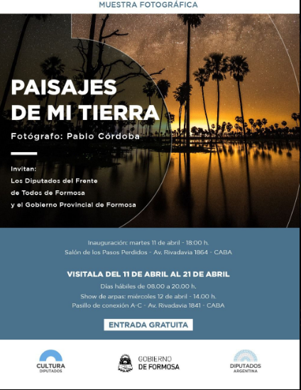 Desde el 10 al 21 de abril, se podrá recorrer la muestra fotográfica “Paisajes de mi tierra” del artista formoseño Pablo Córdoba, organizada por los diputados del Frente de Todos de Formosa, Graciela Parola, Nelly Daldovo y Ramiro Fernández Patri, con el acompañamiento del gobierno provincial, que será exhibida en el entrepiso - pasillo de conexión- del Anexo “A” de la Honorable Cámara de Diputados, ubicado en Av. Rivadavia 1841, CABA.