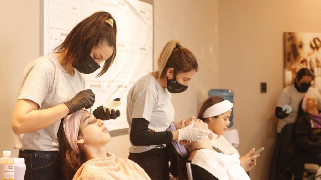 Rodeada de las miradas atentas de sus estudiantes, bowls con distintas cremas preparadas, toallas enrolladas y compresas de algodón sobre las mesas de trabajo, la profesora Gisel Vera dicta las clases de Estética Facial.