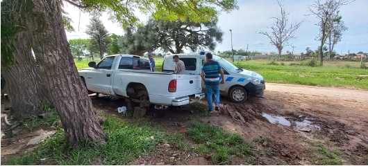 Durante ese trabajo, observaron frente a un taller mecánico de esa localidad, varios vehículos estacionados en la vía pública, entre ellos una camioneta Dogde Dakota que no tenía algunas de sus ruedas.